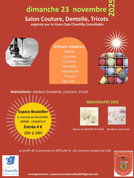 Le Lions Club Chantilly Connétable vous invite à son 3ème Salon Couture, Dentelle & Tricot avec, cette année, un nouvel univers : la broderie !