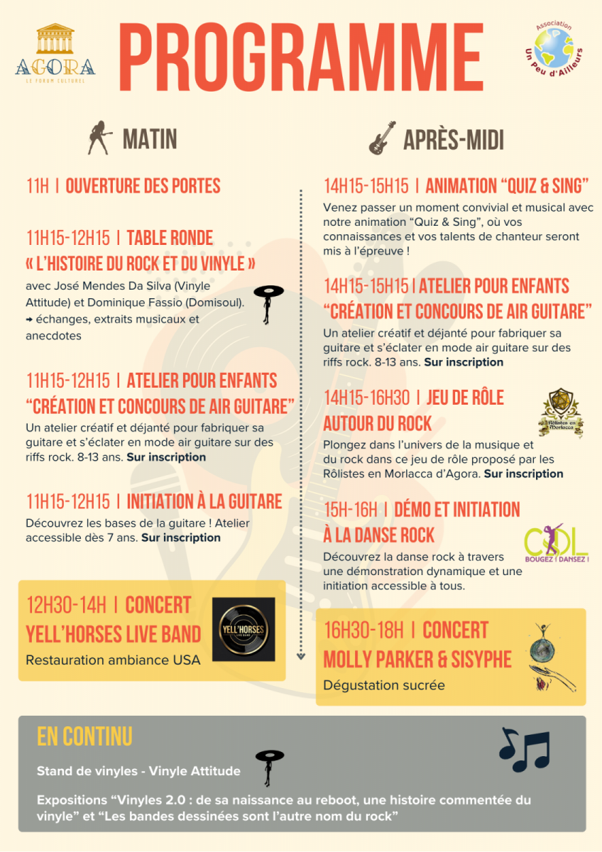 Au programme : concerts live, vinyles, animations musicales, blind test & karaoké, initiation à la guitare, danse rock, expositions et rencontres autour de l’histoire du rock. Une programmation variée et accessible, mêlant musique, jeu et découverte, pour petits et grands.