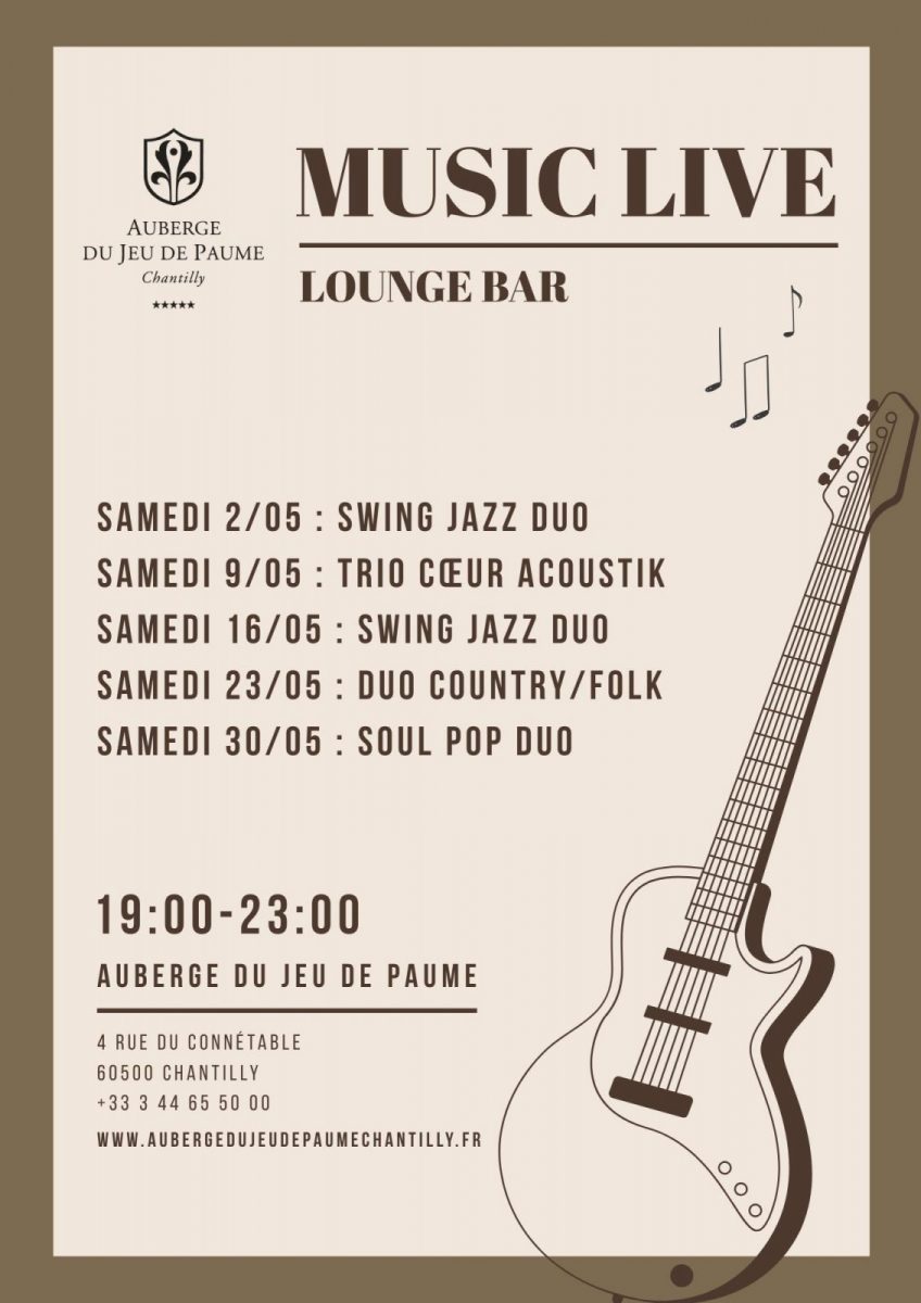 Le lounge bar de l'Auberge du Jeu de Paume 5* - Relais & Château à Chantilly, vous propose régulièrement des soirées "live sessions Jazz".