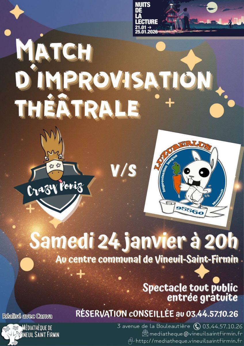 A l'occasion des Nuits de la Lecture, évènement national, la médiathèque vous donne rendez-vous le Samedi 24 janvier pour un match d'improvisation théâtrale. Les Crazy Poniz contre les Luzuberluz !