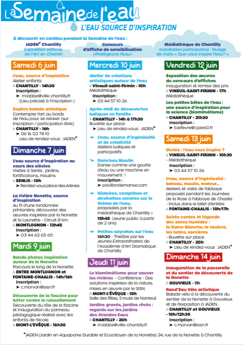 La Semaine de l’eau invite petits et grands à explorer l’eau sous toutes ses formes, comme source d’inspiration, de créativité et de réflexion. À travers une programmation riche et pluridisciplinaire, l’événement met en lumière les liens étroits entre l’eau, la nature, le patrimoine et les activités humaines le long de la Nonette.