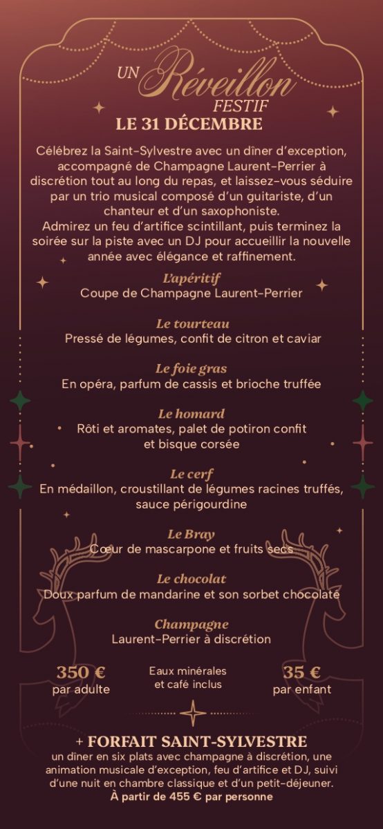 Célébrez la Saint-Sylvestre avec un dîner d’exception, accompagné de Champagne Laurent-Perrier à discrétion tout au long du repas, et laissez-vous séduire par un trio musical composé d’un guitariste, d’un chanteur et d’un saxophoniste.